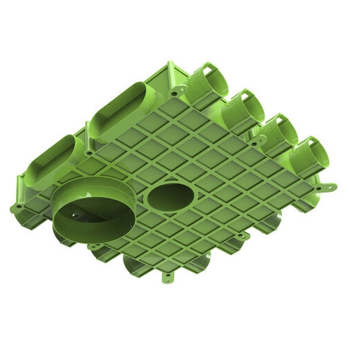 Le caisson de distribution (plafond) D180 fait la connexion entre maximum 12 conduits DucoFlex D63 et le conduit ascendant D180 (en direct). Grâce au principe intelligent « Click & Go », les conduits DucoFlex peuvent être raccordés rapidement et de manière parfaitement étanche.
