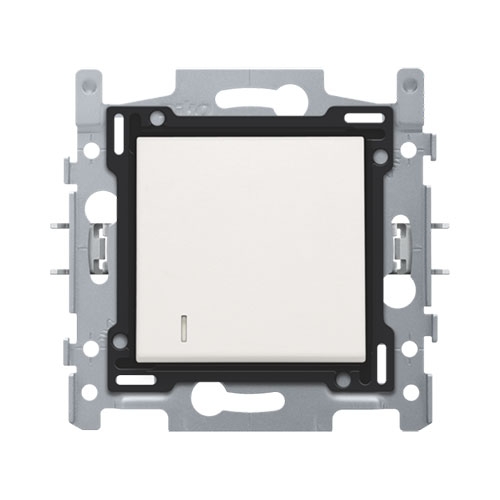 Set de finition avec voyant pour interrupteur ou bouton-poussoir simple, white. L'enjoliveur est entouré d’un bord plat muni aux 4 angles d’une ouverture rectangulaire dans laquelle se trouve un crochet de sécurité multiposition. La partie saillante de l’enjoliveur fait en sorte qu’en cas de plâtrage peu soigneux, la plaque de recouvrement puisse toujours être fixée bien à plat contre le mur grâce aux crochets de sécurité. Ce système fonctionne dans deux sens : si le boîtier d’encastrement dépasse du plâtrage, les crochets de sécurité multiposition compensent un jeu de 1 à 1,2 mm ; si le boîtier d’encastrement est enfoncé trop profondément dans le plâtrage, les crochets de sécurité peuvent compenser un jeu de 1,8 mm max. Le bord plat qui entoure l’enjoliveur comprend également 4 ouvertures rondes qui assurent le positionnement correct de la plaque de recouvrement par rapport à l’enjoliveur. Après le montage de l’ensemble (plaque de recouvrement, set de finition et mécanisme), aucune partie métallique n’est visible grâce au bord plat sur l’enjoliveur.