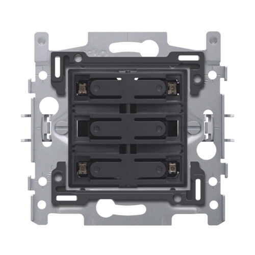 Mécanisme pour quadruple bouton-poussoir libre de potentiel 24 V N.O., avec fixation par griffes. Ce mécanisme est muni de LEDs blanches. Un set de finition d’une couleur au choix doit être commandé séparément.