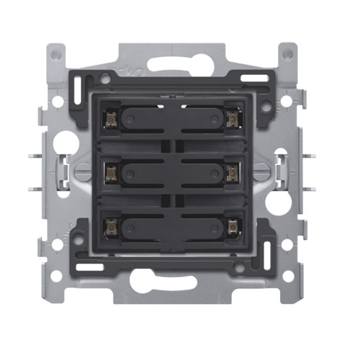 Mécanisme pour sextuple bouton-poussoir libre de potentiel 24 V N.O., avec fixation par griffes. Ce mécanisme est muni de LEDs blanches. Un set de finition d’une couleur au choix doit être commandé séparément.