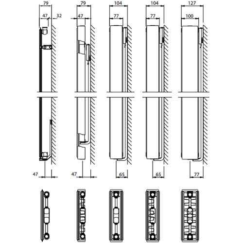 6 x ½” à filetage intérieur. Les types 20, 21 en 22 sont réversibles avant/arrière. La réversibilité du radiateur entraine l’inversion des entrée et sortie.