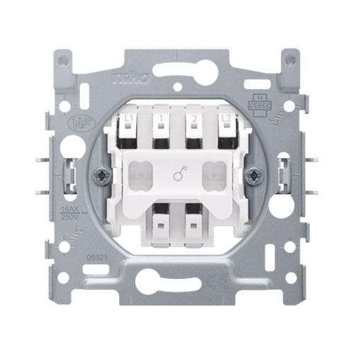 Mécanisme pour un interrupteur bipolaire 16 A, un interrupteur témoin bipolaire 16 A ou un interrupteur à tirage bipolaire 16 A, avec fixation par griffes. Un interrupteur bipolaire vous permet d’allumer ou d’éteindre une seule lampe ou plusieurs lampes commutées en parallèle. Un set de finition et une plaque de recouvrement d’une couleur au choix doivent être commandés séparément.