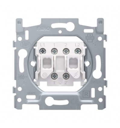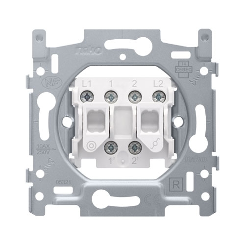 Mécanisme pour un interrupteur double, avec fixation par griffes : un interrupteur va-et-vient et un bouton-poussoir N.O ou N.F. Les interrupteurs va-et-vient sont utilisés pour commander une même lampe à partir de deux endroits différents. Un set de finition et une plaque de recouvrement d’une couleur au choix doivent être commandés séparément.