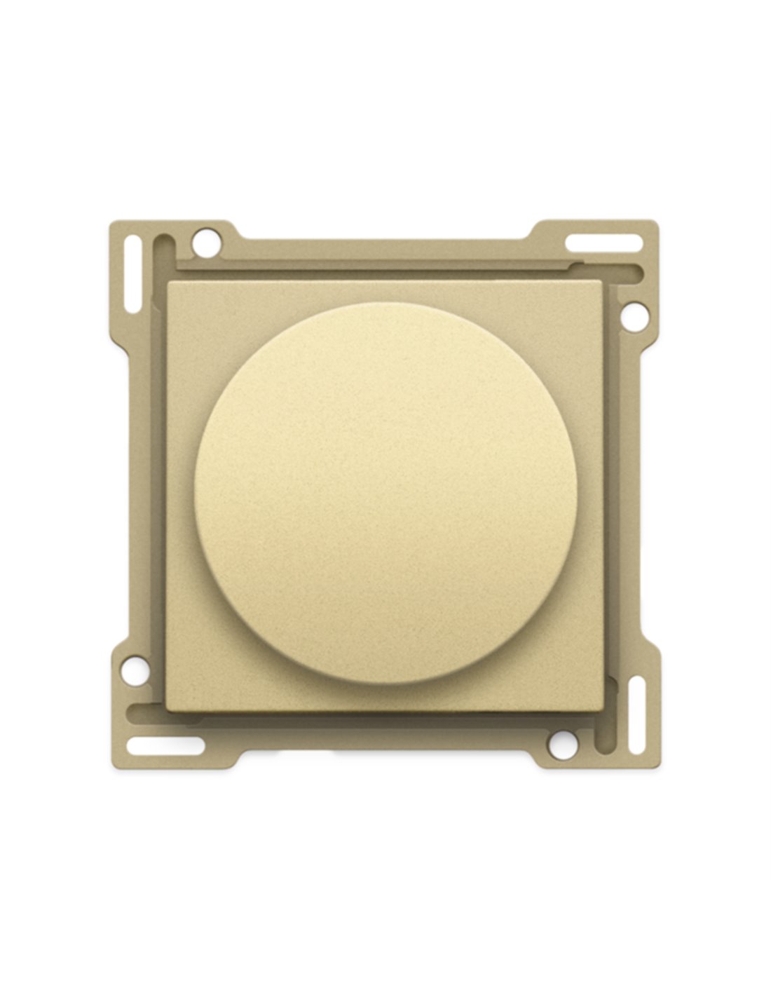 Set de finition pour variateur à bouton rotatif ou régulateur de vitesse, incl. bouton rotatif, couleur gold coated. L'enjoliveur est entouré d’un bord plat muni aux 4 angles d’une ouverture rectangulaire dans laquelle se trouve un crochet de sécurité multiposition. La partie saillante de l’enjoliveur fait en sorte qu’en cas de plâtrage peu soigneux, la plaque de recouvrement puisse toujours être fixée bien à plat contre le mur grâce aux crochets de sécurité. Ce système fonctionne dans deux sens : si le boîtier d’encastrement dépasse du plâtrage, les crochets de sécurité multiposition compensent un jeu de 1 à 1,2 mm ; si le boîtier d’encastrement est enfoncé trop profondément dans le plâtrage, les crochets de sécurité peuvent compenser un jeu de 1,8 mm max. Le bord plat qui entoure l’enjoliveur comprend également 4 ouvertures rondes qui assurent le positionnement correct de la plaque de recouvrement par rapport à l’enjoliveur. Après le montage de l’ensemble (plaque de recouvrement, set de finition et mécanisme), aucune partie métallique n’est visible grâce au bord plat sur l’enjoliveur.