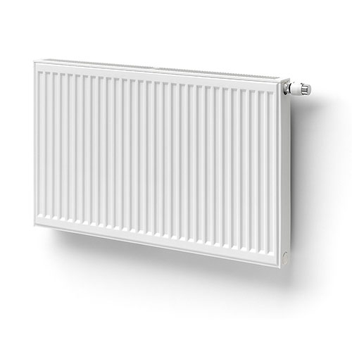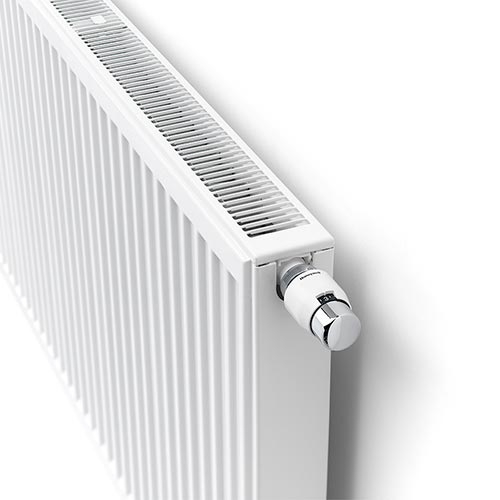 radiateur basse température avec alimentation en série, raccordement central et latéral inférieur et vanne préréglée montable à gauche ou à droite |