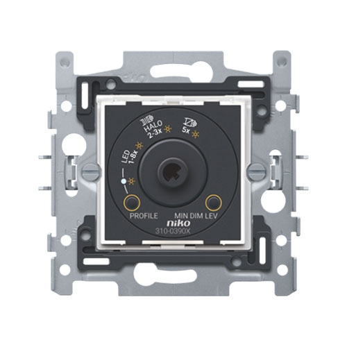 Sokkel voor een universele draaiknopdimmer met CAB-ontstoring, 2-draads aangesloten met een vermogen van 3 tot 300 W. Een afwerkingsset XXX-31003 en afdekplaat in een kleur naar keuze moeten afzonderlijk besteld worden.