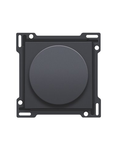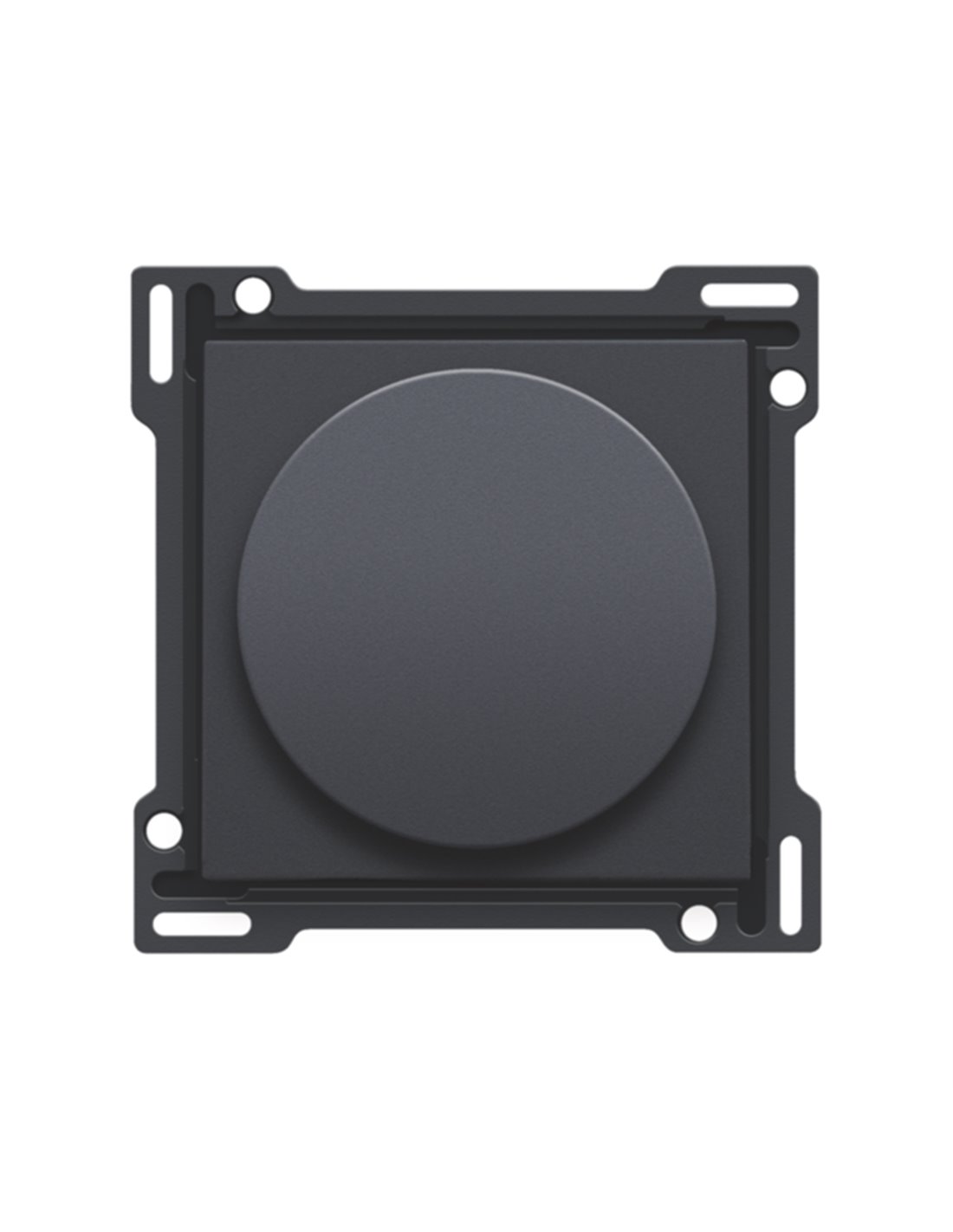 Afwerkingsset voor draaiknopdimmer of snelheidsregelaar, incl. draaiknop, anthracite coated. De centraalplaat is omringd door een vlakke boord die op de 4 hoeken voorzien is van een rechthoekige opening, waarin zich telkens een multipositionele snaphaak bevindt. De opbouw van de centraalplaat zorgt ervoor dat bij onzorgvuldig pleisterwerk de afdekplaat steeds vlak tegen de muur bevestigd kan worden dankzij de snaphaken. Dit werkt in twee richtingen: als de inbouwdoos uit het pleisterwerk steekt, vangen de multipositionele snaphaken een speling tussen 1 à 1,2 mm op; als de inbouwdoos te diep in het pleisterwerk verzonken is, dan kunnen de snaphaken een speling tot 1,8 mm opvangen. De vlakke boord rondom de centraalplaat bevat eveneens 4 ronde openingen die ervoor zorgen dat de afdekplaat correct gepositioneerd kan worden ten opzichte van de centraalplaat. Na montage van het geheel (afdekplaat, afwerkingsset en mechanisme) zijn er, dankzij de vlakke boord aan de centraalplaat, geen metalen delen zichtbaar.