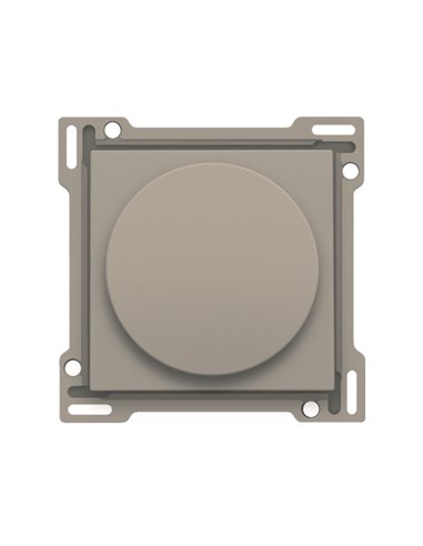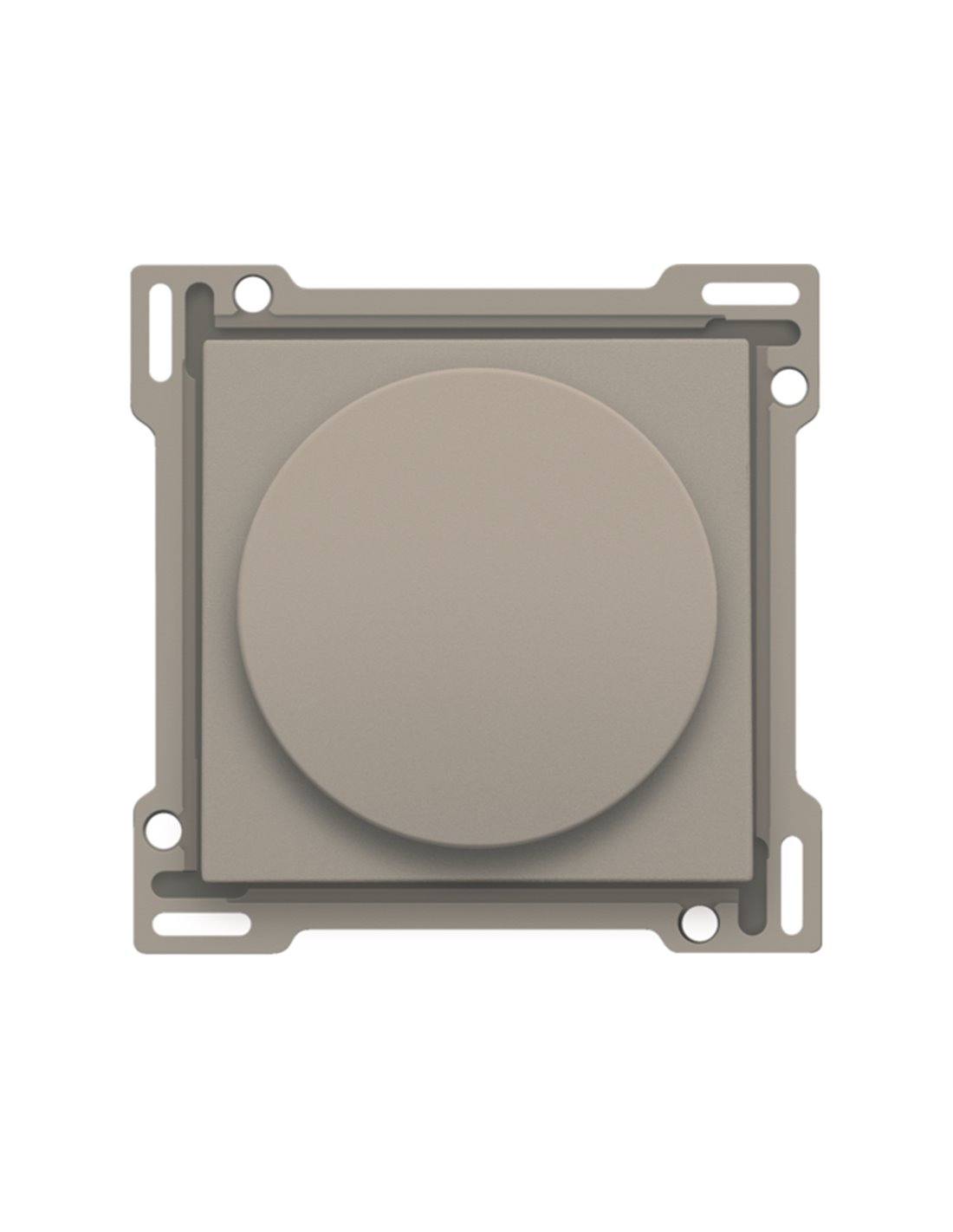 Afwerkingsset voor draaiknopdimmer of snelheidsregelaar, incl. draaiknop, bronze coated. De centraalplaat is omringd door een vlakke boord die op de 4 hoeken voorzien is van een rechthoekige opening, waarin zich telkens een multipositionele snaphaak bevindt. De opbouw van de centraalplaat zorgt ervoor dat bij onzorgvuldig pleisterwerk de afdekplaat steeds vlak tegen de muur bevestigd kan worden dankzij de snaphaken. Dit werkt in twee richtingen: als de inbouwdoos uit het pleisterwerk steekt, vangen de multipositionele snaphaken een speling tussen 1 à 1,2 mm op; als de inbouwdoos te diep in het pleisterwerk verzonken is, dan kunnen de snaphaken een speling tot 1,8 mm opvangen. De vlakke boord rondom de centraalplaat bevat eveneens 4 ronde openingen die ervoor zorgen dat de afdekplaat correct gepositioneerd kan worden ten opzichte van de centraalplaat. Na montage van het geheel (afdekplaat, afwerkingsset en mechanisme) zijn er, dankzij de vlakke boord aan de centraalplaat, geen metalen delen zichtbaar.