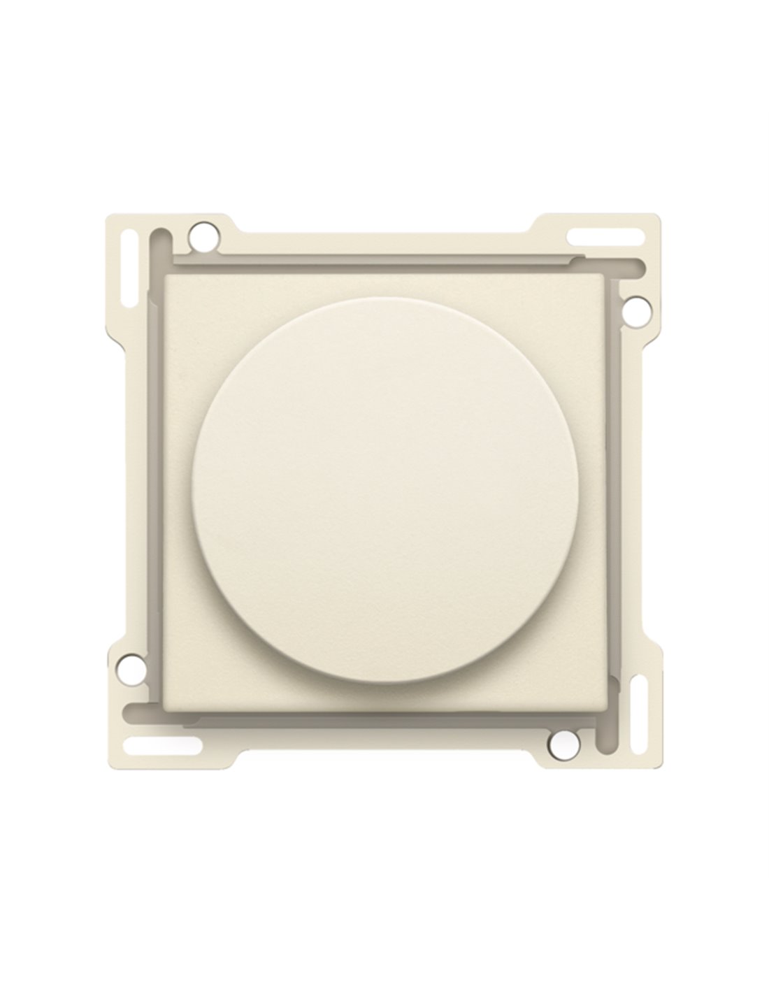 Afwerkingsset voor draaiknopdimmer of snelheidsregelaar, incl. draaiknop, cream. De centraalplaat is omringd door een vlakke boord die op de 4 hoeken voorzien is van een rechthoekige opening, waarin zich telkens een multipositionele snaphaak bevindt. De opbouw van de centraalplaat zorgt ervoor dat bij onzorgvuldig pleisterwerk de afdekplaat steeds vlak tegen de muur bevestigd kan worden dankzij de snaphaken. Dit werkt in twee richtingen: als de inbouwdoos uit het pleisterwerk steekt, vangen de multipositionele snaphaken een speling tussen 1 à 1,2 mm op; als de inbouwdoos te diep in het pleisterwerk verzonken is, dan kunnen de snaphaken een speling tot 1,8 mm opvangen. De vlakke boord rondom de centraalplaat bevat eveneens 4 ronde openingen die ervoor zorgen dat de afdekplaat correct gepositioneerd kan worden ten opzichte van de centraalplaat. Na montage van het geheel (afdekplaat, afwerkingsset en mechanisme) zijn er, dankzij de vlakke boord aan de centraalplaat, geen metalen delen zichtbaar.