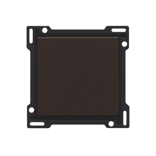 Afwerkingsset voor enkelvoudige schakelaar of drukknop, dark brown. De centraalplaat is omringd door een vlakke boord die op de 4 hoeken voorzien is van een rechthoekige opening, waarin zich telkens een multipositionele snaphaak bevindt. De opbouw van de centraalplaat zorgt ervoor dat bij onzorgvuldig pleisterwerk de afdekplaat steeds vlak tegen de muur bevestigd kan worden dankzij de snaphaken. Dit werkt in twee richtingen: als de inbouwdoos uit het pleisterwerk steekt, vangen de multipositionele snaphaken een speling tussen 1 à 1,2 mm op; als de inbouwdoos te diep in het pleisterwerk verzonken is, dan kunnen de snaphaken een speling tot 1,8 mm opvangen. De vlakke boord rondom de centraalplaat bevat eveneens 4 ronde openingen die ervoor zorgen dat de afdekplaat correct gepositioneerd kan worden ten opzichte van de centraalplaat. Na montage van het geheel (afdekplaat, afwerkingsset en mechanisme) zijn er, dankzij de vlakke boord aan de centraalplaat, geen metalen delen zichtbaar.