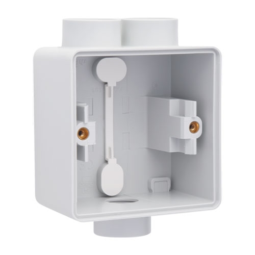 - Functie: De bevestigingspunten bevinden zich 50 mm uit elkaar op een verticale as. Deze maataanduiding bevindt zich onuitwisbaar op de bodem van elke doos. De ovale schroefopeningen laten toe een onnauwkeurige boring op te vangen. Een afdichting waarborgt, door een persborging, de beschermingsgraad en de dubbele isolatie. De doos beschikt over twee diagonaal uitbreekbare condensatieopeningen.