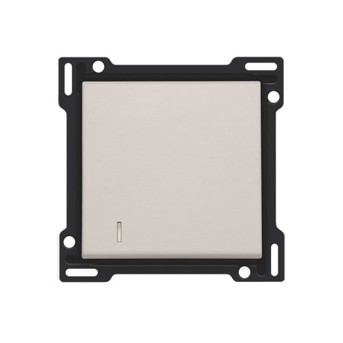Afwerkingsset met lens voor enkelvoudige schakelaar of drukknop, light grey. De centraalplaat is omringd door een vlakke boord die op de 4 hoeken voorzien is van een rechthoekige opening, waarin zich telkens een multipositionele snaphaak bevindt. De opbouw van de centraalplaat zorgt ervoor dat bij onzorgvuldig pleisterwerk de afdekplaat steeds vlak tegen de muur bevestigd kan worden dankzij de snaphaken. Dit werkt in twee richtingen: als de inbouwdoos uit het pleisterwerk steekt, vangen de multipositionele snaphaken een speling tussen 1 à 1,2 mm op; als de inbouwdoos te diep in het pleisterwerk verzonken is, dan kunnen de snaphaken een speling tot 1,8 mm opvangen. De vlakke boord rondom de centraalplaat bevat eveneens 4 ronde openingen die ervoor zorgen dat de afdekplaat correct gepositioneerd kan worden ten opzichte van de centraalplaat. Na montage van het geheel (afdekplaat, afwerkingsset en mechanisme) zijn er, dankzij de vlakke boord aan de centraalplaat, geen metalen delen zichtbaar.