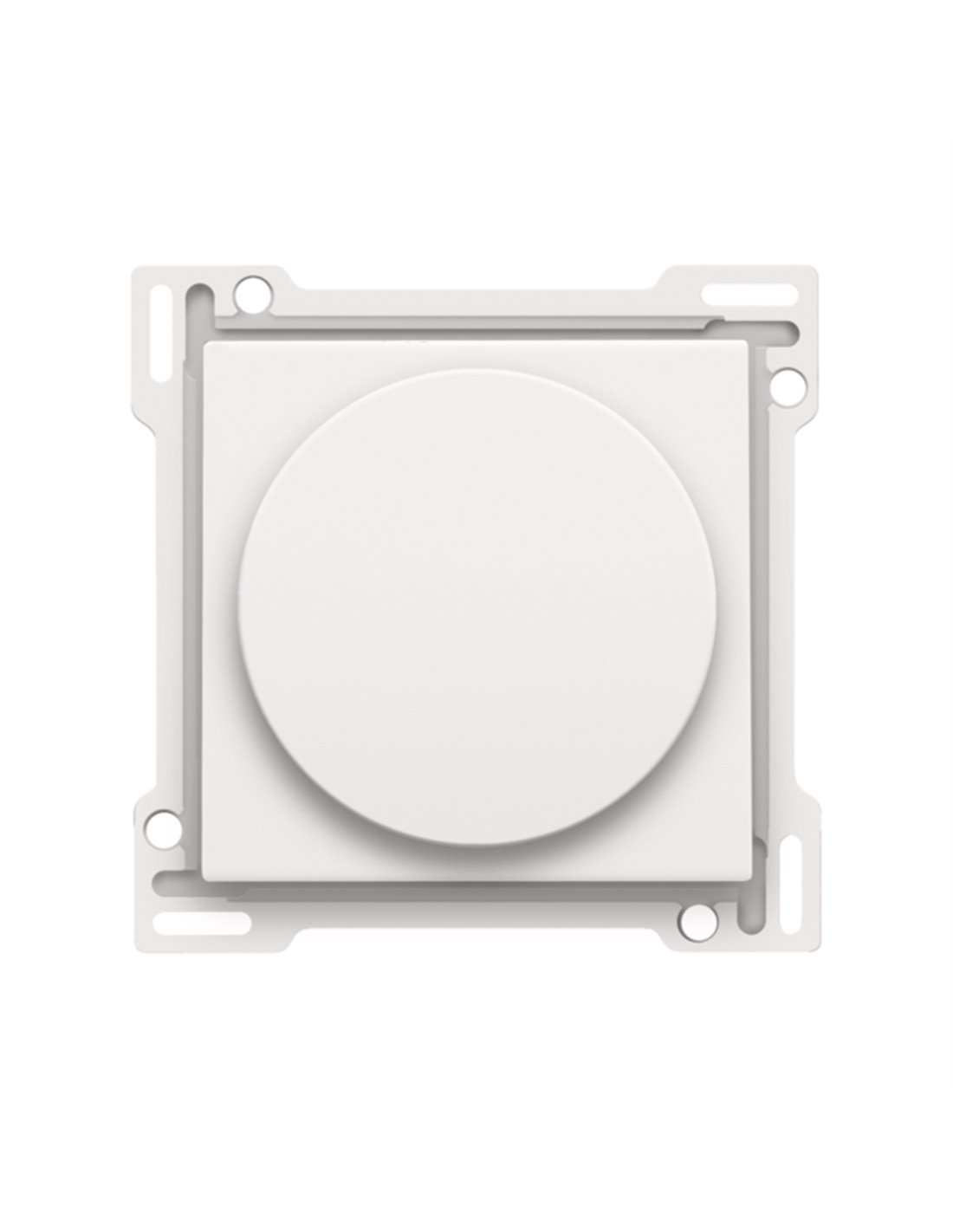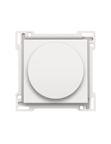 Afwerkingsset voor draaiknopdimmer of snelheidsregelaar, incl. draaiknop, white coated. De centraalplaat is omringd door een vlakke boord die op de 4 hoeken voorzien is van een rechthoekige opening, waarin zich telkens een multipositionele snaphaak bevindt. De opbouw van de centraalplaat zorgt ervoor dat bij onzorgvuldig pleisterwerk de afdekplaat steeds vlak tegen de muur bevestigd kan worden dankzij de snaphaken. Dit werkt in twee richtingen: als de inbouwdoos uit het pleisterwerk steekt, vangen de multipositionele snaphaken een speling tussen 1 à 1,2 mm op; als de inbouwdoos te diep in het pleisterwerk verzonken is, dan kunnen de snaphaken een speling tot 1,8 mm opvangen. De vlakke boord rondom de centraalplaat bevat eveneens 4 ronde openingen die ervoor zorgen dat de afdekplaat correct gepositioneerd kan worden ten opzichte van de centraalplaat. Na montage van het geheel (afdekplaat, afwerkingsset en mechanisme) zijn er, dankzij de vlakke boord aan de centraalplaat, geen metalen delen zichtbaar.
