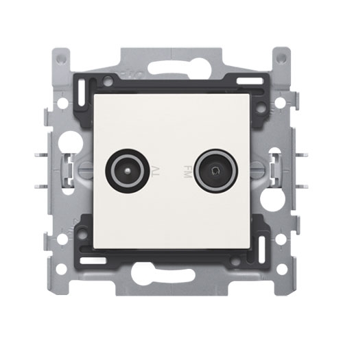 Samengesteld coaxcontact (sokkel en afwerkingsset). De sokkel is uitgerust met schroefklemmen en klauwbevestiging. De sokkel heeft 2 enkelvoudige coaxaansluitingen. Op de centraalplaat staat tevens het TV + FM icoon aangeduid. Afwerkingskleur: white