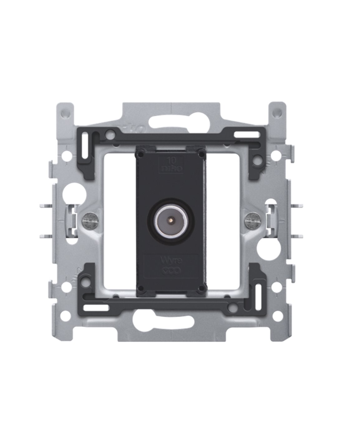 Mechanisme voor een enkelvoudige coaxaansluiting voor tv, met klauwbevestiging. Een afwerkingsset in een kleur naar keuze moet afzonderlijk besteld worden.