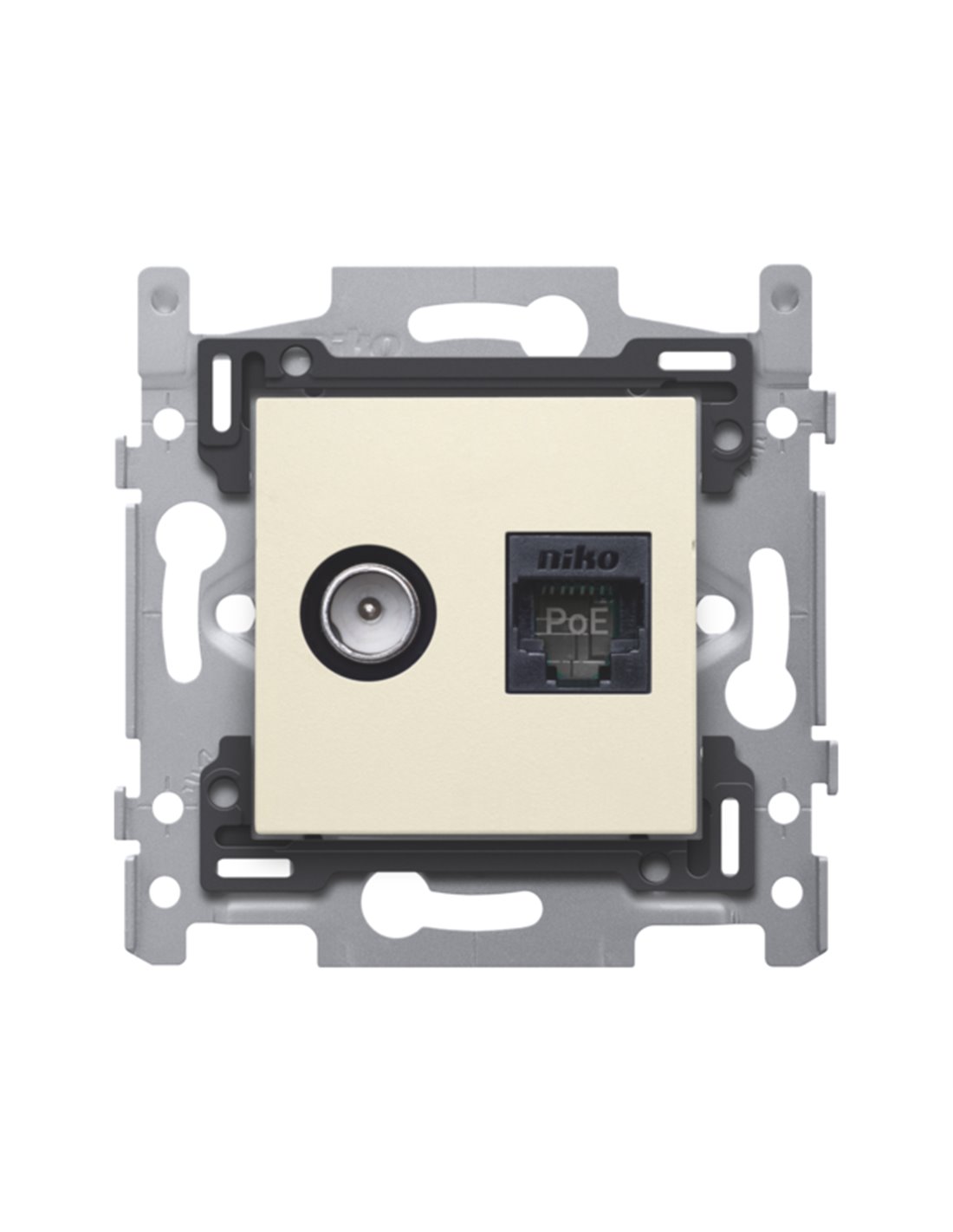 Niko Combinatie coax met RJ45-aansluiting UTP Cat. 6A, klaar voor PoE++, vlakke uitvoering, incl. sokkel 60 x 71 mm met klauwbevestiging en afwerkingsset, cream Goedgekeurd Wyre (Telenet-Interkabel) en VOO - 100-66358