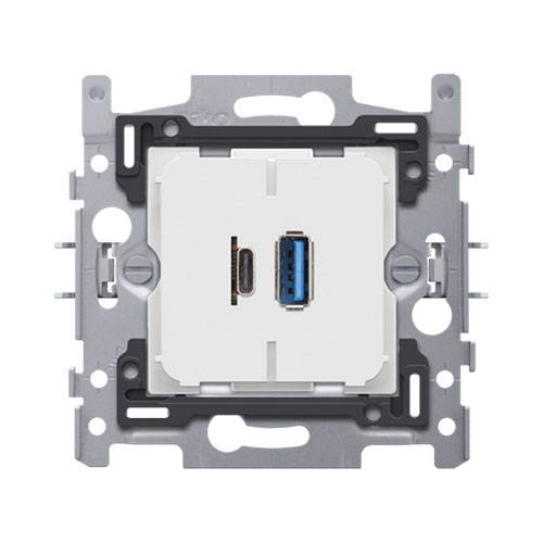 - Functie: De smart USB-lader bestaat uit een module van 45 x 45 x 42 mm (HxBxD) die in een metalen inbouwraam met een opening van 45 x 45 mm geklikt is met twee snaphaken. Op de achterzijde van de module zijn twee gaten voorzien om de klemmen van de aansluitconnector vast te schroeven. De module is aan de voorzijde uitgerust met twee USB-poorten: één USB-A poort en één USB-C poort .De stroom wordt verdeeld over beide uitgangen en bedraagt maximaal 3,5 A over beide uitgangen samen. De maximale stroom bedraagt 3,5 A op de individuele uitgang. Bij gelijktijdig gebruik van beide uitgangen zal de beschikbare stroom verdeeld worden. Per uitgang wordt er 5,0 V geleverd. Het vermogen hangt af van de stroom en de spanning en bedraagt maximaal 17,5 W over beide uitgangen samen.